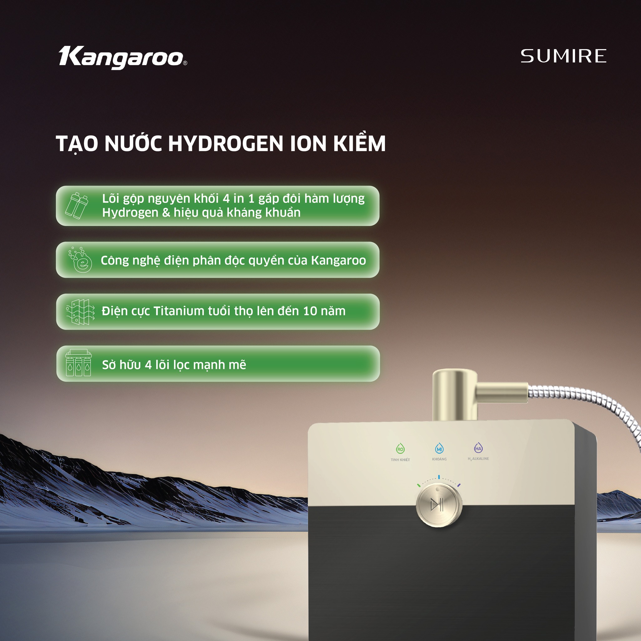 Kangaroo Sumire KGRF04E trang bị lõi gộp nguyên khối 4 in 1 hoàn toàn mới cho tốc độ nước ra vòi nhanh, gấp đôi hàm lượng Hydrogen khoáng chất và hiệu quả kháng khuẩn, kết hợp cùng bộ điện phân sẽ giúp nâng cấp chất lượng nước cho máy lọc gia đình.